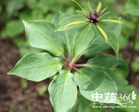 多年生草本,高35~60厘米,全株无毛。根茎粗壮,匍匐。茎直立,有纵条纹,绿色,有时带红色。叶通常为4片,有时5~7片,轮生于茎顶;叶柄长1~4.5厘米;叶片草质,广卵形,长7.3~11.5厘米,宽3.8~7.2厘米,先端短尖而微弯,全缘,基部略近心脏形或截形,主脉3条,基出。花单一,顶生,花柄长10.5~16厘米;花两性,外列被片4瓣,绿色,卵状披针形,长约3厘米,宽1~1.3厘米,先端渐尖,基部具短柄;内列被片4瓣,狭线形,黄绿色,长4.5~6.5厘米;雄蕊12,长约1.2厘米,花丝扁平,花药线形,药隔于顶端延伸成小尖头,长约1毫米;花柱4~5,先端反卷。浆果近于球形,直径约1.8毫米,外有宿存的花被;种子多数,近球形,淡褐色。花期6月。果期7~8月。