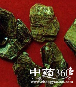 【性状】呈不规则的片状,长约2~6厘米,厚约5厘米。全体暗棕色至墨绿棕色,表明光滑,有网状纹理,具金属光泽。质柔软,表面可用指甲划破并留痕迹。断面呈层状,可剥离成薄片,薄片具可塑性,可随意挠屈。灼热后迅速膨胀。无臭,无味。