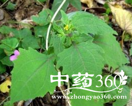 【性状】本品茎略呈方柱形,多分枝,长30~110cm,直径0.3~1cm;表面灰绿色、黄棕色或紫棕色,有纵沟和细纵纹,被灰色柔毛;节明显,略膨大;质脆,易折断,断面黄白色或带绿色,髓部宽广,类白色,中空。叶对生,叶片多皱缩、卷曲,展平后呈卵圆形,灰绿色,边缘有钝锯齿,两面皆有白色柔毛,主脉3出。有的可见黄色头状花序,总苞片匙形。气微,味微苦。