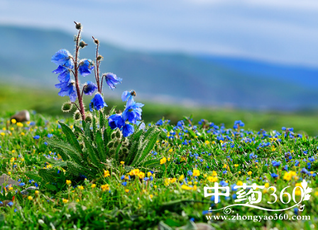 【原形态】总状绿绒蒿 一年生草本,高约40cm。全株被黄褐色或淡黄色坚硬而平展的刺毛,有时刺毛的基部呈紫色。主根长达20cm。茎圆柱形,不分枝。基生叶和茎下部叶具柄,长3-8cm;叶片长圆状披针形、披针形至条形,长5-20cm,宽0.7-4.2cm,先端急尖或钝,基部狭楔形,下延至叶柄基部近鞘状,全缘或波状,稀具不规则的粗锯齿,两面绿色,被刺毛;上部茎生叶具短柄至无柄,叶片长圆状披针形,有时条形。花生于茎上部1/3以上的叶腋内,最上部者无苞片,有时生于混生的花葶上;花梗长2-5cm;萼片长圆状卵形,外面被刺毛;花瓣5-8,倒卵状长圆形,长2-3cm,宽1-2cm,天蓝色或蓝紫色,有时红色,无毛;雄蕊多数,花丝丝状,紫色,花药长圆形,黄色;子房卵形,4-6心皮,密被刺毛,花柱圆锥形,具棱,无毛,柱头长圆形。蒴果卵形或长卵形,密被刺毛,4-6瓣自先端开裂至全长的1/3处,宿存花柱长0.7-1cm。种子长圆形,表面具窗格状网纹,花托膨大成盘状。花期5-8月,果期7-11月。