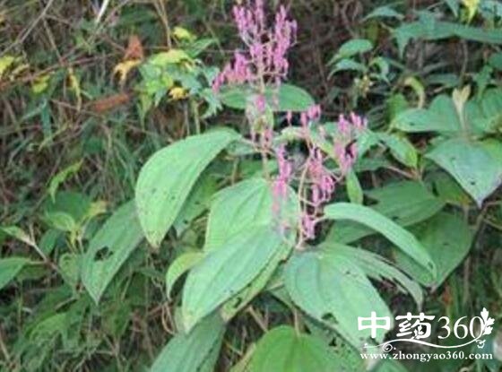 【原形态】 灌木,高1-2m。茎略四棱形或圆柱形,无槽或稀具浅槽,幼嫩时密被平展的腺毛。叶柄长1.5-5.5(-6)cm;叶片薄坚纸质或近膜质,卵形或椭圆形,先端渐尖,基部浅心形至圆形或钝,长11-16.5(-19)cm,宽5-7.5(-9)cm,边缘具不整齐的小齿,齿尖具刚毛,通常具缘毛,5-7基出脉,两面被细小的糠秕状鳞片,叶面基出脉、侧脉平整,背面基出脉、侧脉明显隆起,幼时基出脉、侧脉密被星状毛。由聚伞花序组成的圆锥花序顶生,长12-25cm,宽2.5-6cm,基部具叶状总苞2枚,花序轴、花梗及花萼均密被糠秕状星状毛;苞片和小苞片小,钻形,长约1mm,早落;花萼长约6mm,狭坛形,具钝四棱,具纵脉8条,其中4条不明显,裂片极小,几不明显,先端具突起的小尖头,花瓣红色或粉红色,卵形,长约6mm,于右上角突出一小片,先端具突起小尖头,无毛;雄蕊长者与短者药隔均隆起,基部均伸长成短距;子房纺锤形,下位,无毛。蒴果椭圆形,先端具胎座轴,长约5.5mm,顶孔开裂;宿存萼较果长,坛形,近先端缢缩。花期约10月,果期约3月。