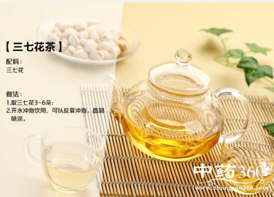 常饮三七花茶,有降血脂、降血压、抗癌,提高心肌供氧能力,增强机体免疫功能;含有人参多种皂甙、平清热肝、降压功效、防治高血压和咽炎;清热解毒、去痘除疮、平肝凉血、降压降脂,三七花性凉味甘,有清热、平肝、降压的功效。三七花总皂甙对中枢神经系统呈抑制作用,表现为镇静、安神功效。用于高血压,头昏、目眩、耳鸣,急性咽喉炎,失眠的治疗。