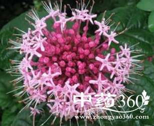 【植物形态】为落叶灌木,高1~2米;根肉质,断面黄白色;小枝被柔毛。叶对生,有较长的柄,叶片纸质,阔卵形至阔卵状心形,长7~20厘米,宽6~16厘米,顶端短尖,基部心形,边缘有粗锯齿至近全缘,两面均被柔毛。头状花序顶生,总花梗较短;花萼小,先端具齿5枚;花玫瑰红色,花冠管纤细,裂片5枚,倒卵状匙形,伸展;雄蕊4枚,生喉部,与花冠管近等长,花柱伸出,略短于雄蕊。核果近球形,黑紫色,具宿存花萼。花期5~7月。