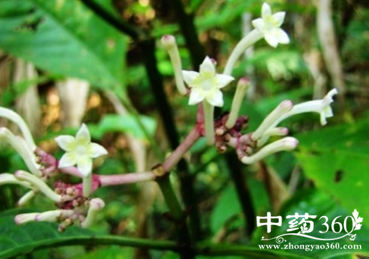 【原形态】直立小灌木,高1-2m。无毛。叶对生;叶柄柔弱,长1-4cm;托叶宽卵形或三角形,长约4mm,全缘或2浅裂;叶片长圆状椭圆形或倒披针形,长10-20cm,宽2.5-7cm,先端渐尖或长渐尖,基部楔形,全缘,干时黄绿色,侧脉8-10对,在背面突起;膜质。花序顶生,长3-7cm,总轴和对生的分枝稍呈扁状,紫红色;苞片小,披针形;弯简倒卵形,长1-1.5mm,顶部5浅裂;花冠管弯曲,长10-15mm,先端4-5裂,裂片卵状三角形,长约2mm,肿胀,具浅槽,向内弯;雄蕊5,花丝长2-5mm,花药长约2.5mm;子房下位于,花柱无毛。核果稍肉质,扁球形,直径3-7mm,平滑或具浅槽,紫黑色;小核脆壳质,有种子1颗。花期6-7月,果期8-9月。
