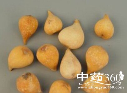 外观呈卵圆形或圆锥形,高约0.7~1.5厘米,直径约0.5~1厘米,底部圆而凹陷,有根痕,上端尖锐,一侧有纵沟,自基部伸向顶端,表面黄白色,十分光滑;质硬而脆,横断面黄白色,粉质,内有一圆锥形心芽;闻之微弱,无香气,口尝味淡。