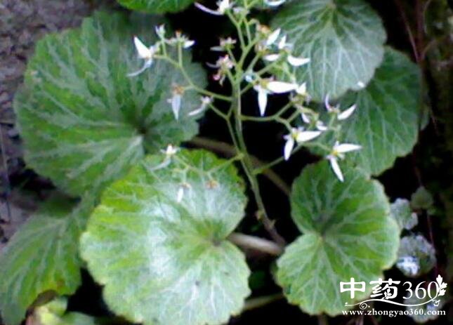 全体被毛。单叶,基部丛生,叶柄长,密生长柔毛;叶片圆形至云肾形,肉质,宽4-9cm,边缘浅裂,疏生尖锐齿牙;下面紫赤色,无毛,密生小球形的细点。花白色,上面3瓣较小,卵形,有黄色斑点,下面2瓣较大,披针形,倒垂,形似虎耳。蒴果卵圆形。气微,味微苦。