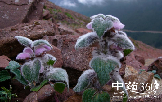 【原形态】多年生草本,全株被绵毛,高10-20cm。根肥厚,圆柱形。茎直立,下部常生于石块堆中,呈白色、肉质,无毛,叶为苞片状,白色无毛。茎上部叶大,两两交互对生,吉片鞭形或圆形,长宽约3-4cm,顶端叶较小,先端急尖,基部宽楔形,边缘在中部以上具圆齿状锯齿,两面密被绵毛;叶柄短或近于无柄。轮伞花序6花,无花梗;小苞片刺状,长达1.2cm,密被绵毛;花萼宽钟形,长约15mm,隐藏于叶丛中,外面密被绵毛,内面在萼齿先端及边缘被绵毛,其余部分无毛,齿5,三角形,近等大,长约7mm;花冠淡紫或粉红色,长2.2-2.8cm,上唇大,盔状,向下弯曲覆盖下唇,外面密被绵毛,下唇小,3裂,中裂片略大,先端微缺;雄蕊4,前对较长,先端突起,花丝有柔毛,后对药丝基部增厚;柱头2裂;花盘平顶。小坚果倒卵圆状三棱形,长约3mm,黄褐色。花期7-9月,果期8-10月。