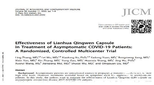 近日,一篇题为《连花清瘟胶囊治疗新型冠状病毒肺炎无症状感染者的有效性:一项随机、对照多中心试验》在《结合与补充医学杂志》(JOURNALOF INTEGRATIVE AND COMPLEMENTARY MEDICINE)刊发。该研究结果显示:使用连花清瘟治疗组患者核酸转阴时间相对对照组缩短近一半时间(7天),出现症状的比例下降47.5%,转为轻型、普通型的比例下降51.4%,首次揭示出连花清瘟治疗新冠肺炎无症状感染者的积极作用。