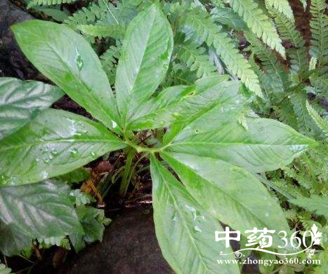 【植物形态】 多年生草本。块茎幼时近球形,渐变为扁柿形,直径3~4cm,通常有数个乳头状或瘤状小块茎,呈虎掌或狗爪形。叶1年生者心形,2年生者鸟趾状分裂,裂片5~13;叶柄长达45cm。佛焰苞披针形,绿色,长8~12cm,肉穗花序下部雌花部分长约1.5cm,贴生于佛焰苞上,上部雄花部分长约7cm;附属体鼠尾状,长约10cm。浆果卵形,绿白色,长约6mm。花期6~7月,果期9~11月。