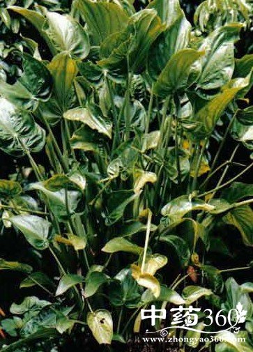 【原形态】多年生常绿草本。根茎粗壮,肉质。茎高可达1米余。叶互生,阔卵形,长15~40厘米,宽10~18厘米,先端渐尖,基部微凹,全缘,叶脉两面凸起,上面暗绿色,下面亮绿色;叶柄肉质,浓绿色,长30~90厘米,柄下部两侧扩展成鞘状。肉穗花序单生;花小形,黄白色,单性同株;佛焰苞肉质,长15~30厘米,管长5~10厘米,上部狭舟形,边包旋,肉穗花序短于佛焰苞;雄花在上部,雄蕊连合成六角形的单体;中性花在中部;雌花在下部,子房1室。浆果淡红色。花期6~7月。果期8月。