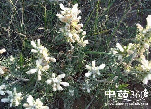 【原形态】脓疮草,多年生草本,高30-35cm。且粗大的木质的主根。茎直立,四棱形,基部近木质化,密被白色短绒毛。叶对生;叶柄与叶片近等长,被绒毛;叶片轮廓为宽卵圆形,宽3-5cm,茎生叶掌状5裂,裂片常达基部,宽2-4mm,常有2-3对大齿或浅裂片,小裂片条状披针形,上面密被短毛,下面被紧密的绒毛。轮伞花序多花,多数密集排列成顶生假穗状花序;小苞片钻形,先端刺尖,被绒毛;花萼筒状钟形,长1.4-1.8cm,外面密被绒毛。轮伞花序多花,多数密集排列成顶生假穗状花序;小苞片钻形,先端刺尖,被绒毛;花萼筒状钟形,长1.4-1.8cm,外面密被绒毛,萼齿5,稍不等大,前2齿略长,先端短刺尖;花冠淡黄或白色,长3-4cm,外面被丝状长柔毛,上唇盔状,下唇浅3裂,有红条纹,中裂片较大,心形,侧裂片卵圆形;雄蕊4,前对稍长,略被微毛柔毛,花药2室;子房4裂,花柱略短于雄蕊,柱头2浅裂;花备用平顶。小坚果卵状三棱形。花期7-9月,果期8-10月。