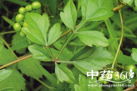 【原形态】白蔹 落叶攀援木质藤本,长约1m。块根粗壮,肉质,卵形、长圆形或长纺锤形,深棕褐色,数个相聚。茎多分枝,幼枝带淡紫色,光滑,有细条纹;卷须与叶对生。掌状复叶互生;叶柄长3-5cm,微淡紫色,光滑或略具细毛;叶片长6-10cm,宽7-12cm;小叶3-5,羽状分裂或羽状缺刻,裂片卵形至椭圆状卵形或卵状披针形,先端渐尖,基部楔形,边缘有深锯齿或缺刻,中间裂片最长,两侧的较小,中轴有闲翅,裂片基部有关节,两面无毛。聚伞花序小,与叶对生,花序梗长3-8cm,细长,常缠绕;花小,黄绿色;花萼5浅裂;花瓣、雄蕊各5;花盘边缘稍分裂。浆果球形,径约6mm,熟时白色或蓝色,有针孔状凹点。花期5-6月,果期9-10月。