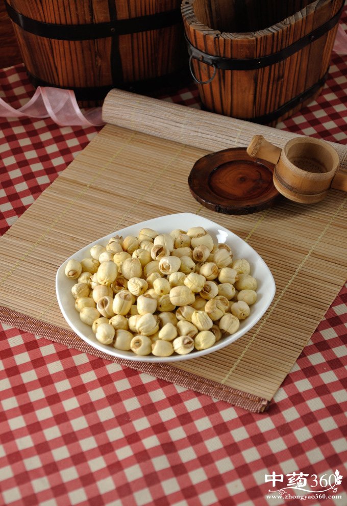 莲子为睡莲科多年生水生草本植物莲的成熟种仁,8~9月间采收成熟莲房,取出果实,去皮心,晒干备用。