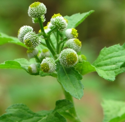 一年生草本,高10~25厘米。茎略带紫色,密被白色柔毛。叶互生,倒卵形或矩圆状椭圆形,长3.5~7厘米,宽1.2~2.4厘米,先端锐尖,基部渐狭成耳形,边缘有不规则齿缺,在茎中部以下者,常成琴状羽裂,两面均被柔毛;无柄。头状花序极小,排列成圆锥花序,异型,球状或半球状;总苞不明显,苞片2列,卵状披针形或卵形,绿色,缘膜质,少被绒毛;花托半球形,具多数椭圆形突起;花管状,外缘为雌花,多列,花冠白色,圆锥形,先端2裂;中部为两性花,花冠绿黄色,钟状,先端4裂;雄蕊4,花药基部2齿裂;雌蕊I,花柱伸出花冠之外。瘦果扁平,无冠毛。花期春末至夏、秋。