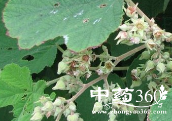 【原形态】落叶灌木。高2~5米。茎圆柱形,无刺,密被灰褐色茸毛,有时混生刚毛。单叶,近圃形或宽卵形,直径6~17厘米,先端急尖或圆钝,基部心形,边缘有不整齐锯齿,常有不明显的5~7裂,上面粗糙,下面灰绿色,网脉明显,有短绒毛;叶柄长5~7厘米;托叶较宽,近似卵圆形,基部不对称,顶端浅裂,有早落现象。圆锥花序顶生或成腋生花丛;总花梗和花梗密生绒毛;花紫色,直径1~1.5厘米;萼裂片三角状卵形,先端尾尖,内外两面有茸毛;花瓣倒卵圆形;雄蕊多数。聚合果近球形,直径6~8毫米,黑色。花期6~7月。果期8~9月。