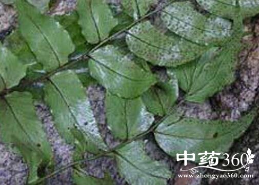 为植物蛾眉蕨的干燥根茎。呈长卵圆形,上端钝圆,下端较尖;长10~16厘米,直径6~10厘米;黑褐色。叶柄残基上部较宽而扁,向下渐细,两侧边缘具有明显的刺状突起,基部较窄常呈菱方形;质硬而脆,易折断,断面平坦,维管束2条,呈“八”字形排列;维管束中间,常有-个暗色点或已成空洞。叶柄基部外侧生有1或3条须根,常扁压,有分支。气微而特异,味涩或苦辛。