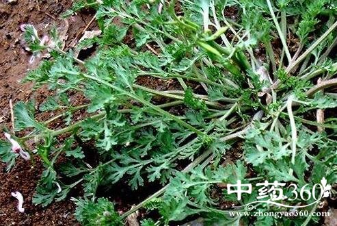 【性状】:为干燥皱缩全草,长5~10厘米,叶具长柄;叶片3回羽状深裂,裂片狭细。叶腋有淡紫色小花,或长椭圆形扁平的荚果,表面灰绿色,内含数粒扁圆形、黑色的种子。味苦。