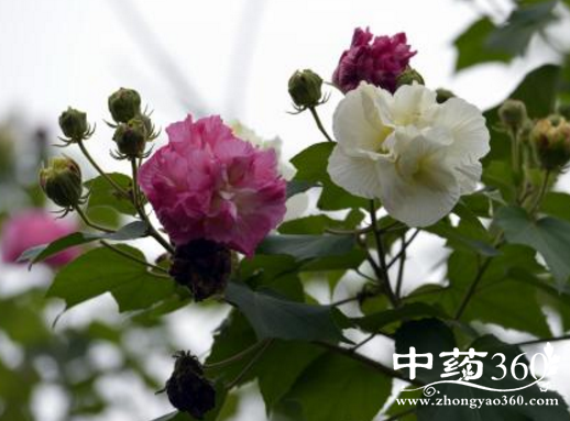 【功能主治】:清热解毒,消肿排脓,凉血止血。用于肺热咳嗽,月经过多,白带;外用治痈肿疮疖,乳腺炎,淋巴结炎,腮腺炎,烧烫伤,毒蛇咬伤,跌打损伤。有名的“玉露散”和“芙蓉花油”就是用木芙蓉的花和叶制成的。