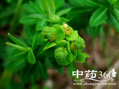花序单中药材植株生长于二歧分枝顶端,无柄;总苞杯状,高约3.5毫米,直径3.5-4.0毫米,边缘4裂,裂片半圆形,边缘具不明显的缘毛;腺体4,半圆形或肾状圆形,淡褐色。雄花多数,伸出总苞之外;雌花1枚,具较长的子房柄,柄长3-5 六、毫米;子房幼时被较密的瘤状突起;花柱3,分离;柱头2裂。