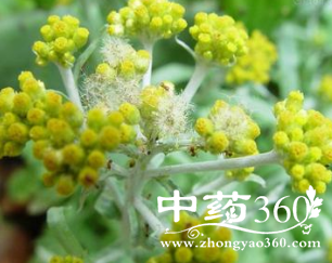 【药材性状】全株密被灰白色绵毛。根较细,灰棕色。茎常自基部分成丛,长15~ 30厘米,直径0.1~0.2厘米。基生叶已脱落;茎生叶互生,无柄,叶片皱缩,展平后呈条状匙形或倒披针形,长2~6厘米,宽0.3~1厘米,全缘,两面密被灰白色绵毛。头状花序多数,金黄色或棕黄色。气微,味微甘。