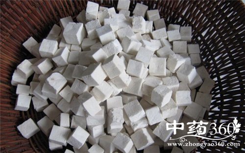茯苓,中药名。为多孔菌科真菌茯苓Poriacocos(Schw.)Wolf的干燥菌核。多于7~9月采挖,挖出后除去泥沙,堆置“发汗”后,摊开晾至表面干燥,再“发汗”,反复数次至现皱纹、内部水分大部散失后,阴干,称为“茯苓个”;或将鲜茯苓按不同部位切制,阴干,分别称为“茯苓块”和“茯苓片”。
