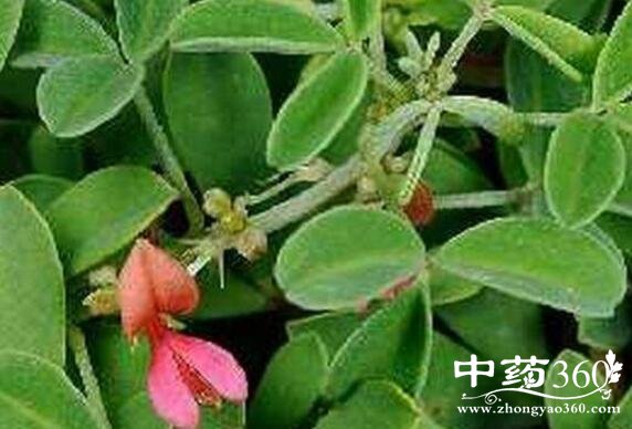 【性状】 性状鉴别 全草长30-60cm,上部草质,基部木质。小叶3个或脱落,倒长卵形或倒椭圆形,长1-2.5cm,宽4-7mm,先端圆,具小尖,基部楔形,两面均被白色柔毛,下面可见暗褐色腺点。总状花序腋生,萼钟状,密生长硬毛,花冠红棕色,比萼长2-3倍。荚果条形,长1-1.6cm,种子6-8枚。
