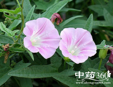 【原形态】多年生草本,丛生细毛。茎缠绕或匍匐,基部分枝。叶互生,长圆形或披针状长卵形,长4~8厘米,宽1~3厘米,先端圆钝,具细尖头,基部心脏戟形,下部叶全缘,上部叶常3裂,中裂片长圆或披针形,两侧裂片较短,三角形,开展,叶柄短于叶片。花单生于叶腋,花梗长达3~10厘米;萼5,萼外有2枚大形苞片;花冠漏斗形,粉红色,5浅裂;雄蕊5,内藏;雌蕊1。蒴果球形,光滑。种子卵圆形,无毛。