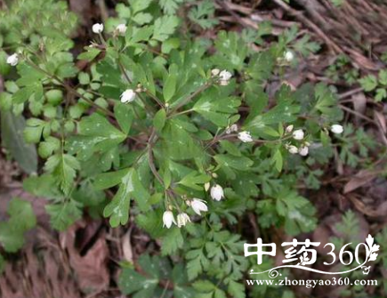 多年生草本,高15~40厘米。块根灰黑色,略呈纺锤形或椭圆形。茎丛生,纤细,直立,有分枝,表面有白色细柔毛。根生叶丛生,有长柄;1回3出复叶,小叶阔楔形,再3裂,裂片先端圆,或有2~3小缺刻,上面绿色,下面紫色,光滑无毛;小叶柄短,有细柔毛;茎生叶与根生叶相似,惟由下而上,渐次变小。花单生叶腋,花柄果后伸长,中部有细苞片2枚;花小,白色;萼片5,花瓣状,卵形;花瓣5,楔形,较萼片稍短;雄蕊通常10,其中有2枚不完全发育者;雌蕊3~4,子房狭长,花柱短,向外反卷。蓇葖果3~4枚,荚状,熟时开裂。种子细小,倒卵形。花期3~4月。果熟期5~6月。