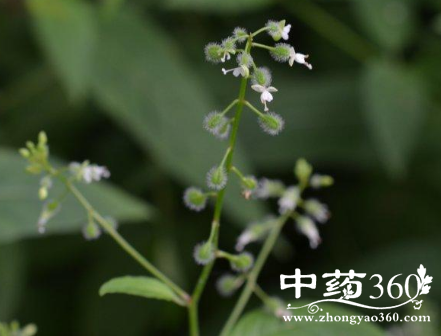 多年生草本,高40~70厘米。茎绿色,密被短柔毛,叶对生,卵形,长5~9厘米,宽4~8厘米,先端渐尖,基部浅心形,边缘疏生锯齿,两面均被短柔毛;叶柄长4~8厘米,被毛。总状花序顶生,花序轴密被短柔毛;苞片小;花两性,白色;萼筒卵形,裂片2;花瓣2,宽倒卵形,短于萼裂片,顶端凹缺;雄蕊2;子房下位,2室。果实坚果状,倒卵状球形,外被浅棕色钩状毛;果柄被毛,稍短于果实或近等长。