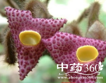 原形态广西马兜铃 木质大藤本。块根椭圆形或纺锤形,常数个相连。嫩枝有棱,密被污黄色或淡棕色长硬毛。叶柄长6-15cm,密被长硬毛;叶片厚纸质至革质,卵状心形或圆形,长11-25cm,宽9-22cm,先端钝或短尖,基部宽心形,边全缘,嫩叶上面疏被长硬毛,成长叶两面均密被污黄色或淡棕色长硬毛,基出脉5条,网脉下面明显隆起。总状花序腋生,有花2-3朵;花梗常向下弯垂,密被污黄色或淡棕色长硬毛;小苞片钻形,密被长硬毛;花被管中部急剧弯曲,弯曲处至檐部与下部近等长而较狭,外面淡绿色,具褐色纵脉纹和纵棱,密被淡棕色长硬毛,内面无毛;檐部盘状,上面蓝紫色而有暗红色棘状突起,具网脉,外面密被棕色长硬毛,边缘浅3裂,裂片阔三角形,先端短尖,喉部近圆形,黄色,稍突出成领状;花药成对贴生于合蕊柱近基部;子房圆柱形,6棱;合蕊柱裂片边缘向下延伸而翻卷,具乳头状突起。蒴果暗黄色,长圆柱形,长8-10cm,有6棱,成熟时自先端向下6瓣开裂。种子卵形。花期4-5月,果熟期8-9月。