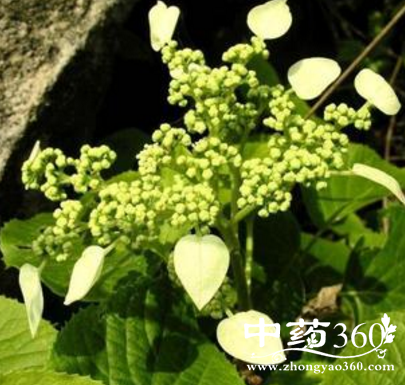 落叶本质藤本,借气根攀援,高至4米以上。叶对生,叶片卵圆形至阔卵圆形,长8~15厘米,先端渐尖,基部截形或圆形至心形,全缘或前半部疏生小齿,质厚,下面叶脉有细毛或近无毛;叶柄长3~8厘米。伞房式聚伞花序顶生;花2型;周边为不育花,仪具一片大形萼片,狭卵形至椭圆状技针形,长约4~6厘米,宽约3厘米,先端短尖,乳白色,老时棕色,萼片柄细弱,长2~4厘米;孕性花小,绿色;萼片4~5;花瓣4~5;雄蕊10;花柱1。蒴果陀螺状,长6毫米,有10肋。种子多数,线形。花期6~7月。