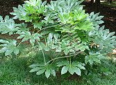 常绿灌木或小乔木,高可达5m。茎光滑无刺。叶柄长10-30cm;叶片大,革质,近圆形,直径12-30cm,掌状7-9深裂,裂片长椭圆状卵形,先端短渐尖,基部心形,边缘有疏离粗锯齿,上表面暗亮绿以,下面色较浅,有粒状突起,边缘有时呈金黄色;侧脉搏在两面隆起,网脉在下面稍显著。圆锥花序顶生,长20-40cm;伞形花序直径3-5cm,花序轴被褐色绒毛;花萼近全缘,无毛;花瓣5,卵状三角形,长2.5-3mm,黄白色,无毛;雄蕊5,花丝与花瓣等长;子房下位,5室,每室有1胚球;花柱5,分离;花盘凸起半圆形。果产近球形,直径5mm,熟时黑色。花期10-11月,果熟期翌年4月。