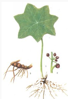 1.生草本,茎直立,高20-30cm。不分枝,无毛,淡绿色。根茎粗壮,横生,具明显的碗状节。茎生叶1片,有时2片,盾状着生;叶柄长10-15cm;叶片圆形,直径约30cm,常状深裂几达叶中部,边缘4-9浅裂或深裂,裂片楔状长圆形或卵状椭圆形,长2.5-9cm,宽5-7cm,先端锐尖,边缘具针刺状锯齿,上面无毛,下面密被或疏生柔毛。花5-8朵排成伞形花序,着生于近叶柄基处的上方近叶片处;花梗细,长约5cm,花下垂,花冠深结色;萼片6,外面被疏毛;花瓣6,勺状倒卵形,长约2.5cm;雄蕊6,蕴含隔突出;子房上位,1室,柱头大,盾状。浆果椭圆形或卵形。种子多数。花期4-6月,果期8-10月。
