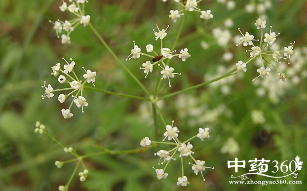 多年生草本,高30~80厘米,全体无毛。根粗壮,茎基密生褐色纤维状的叶柄残基。茎单生,2歧分枝。基生叶三角状卵形,长7~19厘米,2~3回羽状分裂,最终裂片条形至披针形,全缘;叶柄长2~6.5厘米;顶生叶简化,具扩展叶鞘。复伞形花序,顶生;伞梗5~9,不等长;总苞片缺如;小伞形花序有花4~9朵,小总苞片4~5,披针形;萼齿短三角形,较显著;花瓣5,白色,倒卵形,凹头,向内卷;子房下位,2室,花柱2,花柱基部圆锥形。双悬果卵形,幼嫩时具疣状突起,成熟时裂开成2分果,悬挂在二果柄的顶端,分果有棱。花期8~9月;果期9~10月。