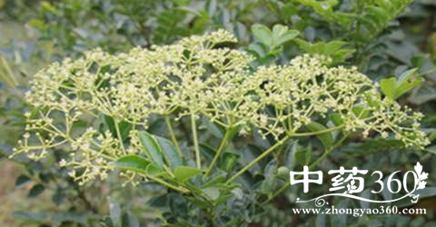 圆锥花序顶生,疏散的3歧,或2-3次伞形花序式的分枝,约与叶等长;花序柄长5-9厘米;花单性,萼片5,卵形;花瓣5,白色,长约2毫米;雄花的雄蕊5,退化心皮短小;雌花的雄蕊退化为鳞片,心皮2,柱头头状。蓇葖果紫红色,有粗大腺点。种子黑色而亮。花期6-8月。果期9-10月。