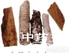 【药材性状】卷筒状或卷曲长片状,长短不一,外表面青灰白色、灰黄色或灰褐色,粗糙,常有横皱纹及灰白色斑块;内表面有细纵皱纹,稍平滑,微具光泽,棕褐色或黑褐色。质坚硬而脆,可折断,断面略平坦,稍呈颗粒性,黄棕色或棕褐色。气微香,味苦微涩。