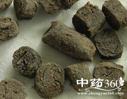本品呈方块状或圆柱状。棕黄色、灰棕色或棕黑色。质硬。气微腥,味苦。