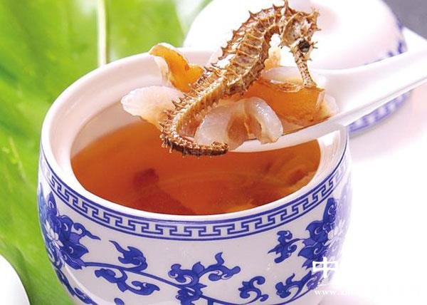 2、海马苁蓉鸡:海马1对,肉苁蓉30g,菟丝子15g,仔公鸡1只。仔鸡去肠杂,洗净,切块,加水与海马一同煨炖;苁蓉、菟丝子水煎取浓汁,待鸡烂熟时加入,用生姜、胡椒、盐等调味。