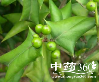 原形态枸骨 常绿小乔木或灌木,高3-8m。树皮灰白色,平滑。叶硬革质,长椭圆状四方形,长4-8cm,宽2-4cm,先端具有3枚坚硬刺齿,中央刺齿反曲,基部平截,两侧各有1-2个刺齿,先端短尖,基部圆形,表面深绿色,有光泽,背面黄绿色,两面无毛。雌雄异株或偶为杂性花,簇生于2年生枝的叶腋;花黄绿色,4数;萼杯状,细小;花瓣向外展开,倒卵形至长圆形,长约2.5mm,宽约1.5mm,基部合生;雄蕊4枚,花丝长约3mm;子房4室,花柱极短。核果浆果状,球形,熟时鲜红色,直径4-8mm;分核4颗,骨质。花期4-5月,果期9-10月。
