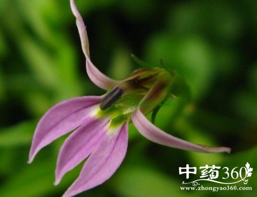 【原形态】半边莲 多年生矮小草本,高公达10cm。茎细长,多匍匐地面,在节上生根,分枝直立,无毛,折断有白色乳汗渗出。叶互生;无柄或近无柄;叶片狭披针形或条形,长8-25mm,先端急尖,全缘或有波状疏浅锯齿,无毛。花两性,通常1朵,生分枝的上部叶腋,基部有长约1mm的小苞片2枚、1枚或无,小苞片无毛;花萼筒倒长锥状,基部渐细与花梗无明显区分,长3-5mm,无毛,裂片5,狭三角形;花冠粉红色或白色,长10-15mm,背面裂至基部,喉部以下具白色柔毛,裂片5,全部平展于下方,呈一个平面,2个侧裂片披针形,较长,中间3枚裂片椭圆状披针形,较短;雄蕊5,长约8mm,花丝上部与花药合生,花药位于下方的2个有毛,上方的3个无毛,花丝下半部分离;雌蕊1,子房下位,2个有毛,上方的3个无毛,花丝下半部分离;雌蕊1,子房下位,2室。蒴果倒锥状,长约6mm。种子椭圆状,稍扁平,近肉色。花期5-8月,果期8-10月。