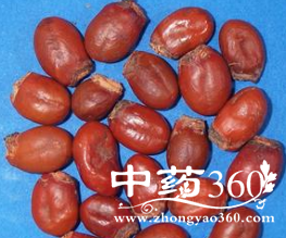 【药材性状】长圆形或卵圆形,略扁。表面棕红色或紫棕色,平滑,有光泽,略有凹陷及细波纹。一端有类圆形黄棕色的种脐。质硬,子叶棕黄色。气微,味微甘、苦、涩。