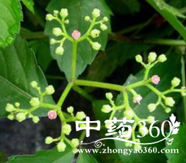 【植物形态】多年生蔓生草本。茎紫绿色,有纵棱,具卷须;幼枝有柔毛,后变光滑。掌状复叶,具小叶5枚,排列成鸟爪状,中间小叶椭圆状卵形,两侧的4枚小叶渐小,成对生于同一小叶柄上,但又各具小分叶柄,小叶边缘具较均匀的圆钝锯齿。聚伞花序腋生,花小,黄绿色,具短梗;萼杯状;花瓣4,卵状三角形;雄蕊4,与花瓣对生,花药长椭圆形;雌蕊1,子房上位,2室。浆果倒卵形,成熟时黑色;种子2~4粒。花期5~11月,果期8~10月。