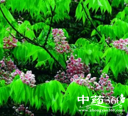 【原形态】落叶乔木,高达20米。树皮灰白色,平滑;小枝粗壮,其上有大而圆形的叶痕。单数羽状复叶,长达80厘米,互生;小叶7~15枚,对生,矩圆形。狭卵形或狭倒卵形,不对称,基部圆形或阔楔形,先端短而渐尖,全缘,上面无毛,有光泽,下面粉白色,沿中脉有褐色毛丛。总状花序顶生,轴密被锈色柔毛;花萼钟形,具不明显的5齿,外面密被柔毛;花瓣5,粉红色;雄蕊5~9;子房3室。蒴果椭圆球形或近球形,木质。种子近球形。