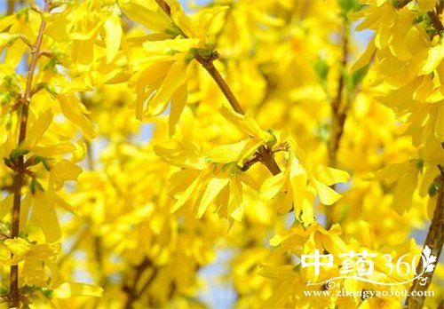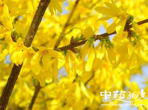 连翘又名黄花条、连壳、青翘、落翘、黄奇丹等,果实入药。连翘是清热解毒的中药,主治热病初起,风热感冒,发热,心烦,咽喉肿痛,急性肾炎等。连翘早春先叶开花,花开香气淡艳,满枝金黄,艳丽可爱,是早春优良观花灌木。