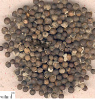 【药材性状】圆球形,上端稍大略平而圆,下端稍尖,长约3毫米,径约2毫米;宿萼灰褐色,密被棕色细茸毛,包围整个果实的2/3左右,但多半已脱落;基部具短柄;果实外表棕褐色,较光滑,表面纵脉纹明显,果皮较厚,质较硬,不易破碎。内藏白色种子数枚。气香,味苦带涩。