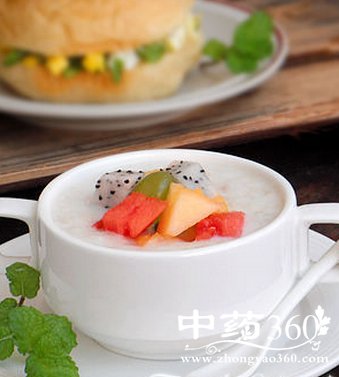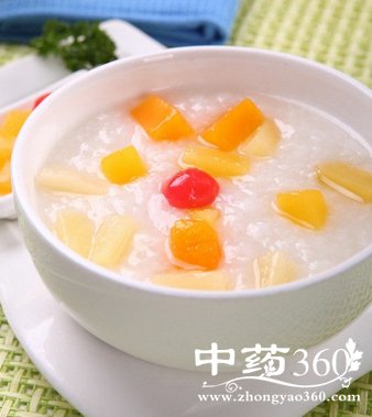 制法:将水果洗净、切成碎粒;将米饭加水煮至粘稠;加入水果拌匀即可。