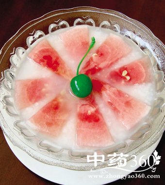 做法:西瓜去籽、切块,西米浸涨,橘饼切成细丝状;把去籽西瓜瓤、冰糖、橘饼放进锅内一同煮开;加入浸泡发涨后的西米煮熟,西瓜粥即可。