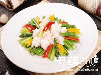 虾仁:虾仁营养丰富,肉质松软,易消化,对身体虚弱以及病后需要调养的人是极好的食物;虾肉中含有丰富的镁,能很好的保护心血管系统,它可减少血液中胆固醇含量,防止动脉硬化,同时还能扩张冠状动脉,有利于预防高血压及心肌梗死;虾肉还有补肾壮阳,通乳抗毒、养血固精、化瘀解毒、益气滋阳、通络止痛、开胃化痰等功效。芦笋:芦笋是一种高档而名贵的蔬菜,含有多种维生素和微量元素的质量优于普通蔬菜,其蛋白质组成具有人体所必需的各种氨基酸,含量比例恰当,无机盐元素中有较多的硒、钼、镁、锰等微量元素,还含有大量以天门冬酰胺为主体的非蛋白质含氮物质和天门冬氮酸。经常食用对心脏病、高血压、心率过速、疲劳症、水肿、膀胱炎、排尿困难等病症有一定的疗效。同时芦笋对心血管病、血管硬化、肾炎、胆结石、肝功能障碍和肥胖均有益。而且芦笋对于淋巴腺癌、膀胱癌、肺癌、肾结石、皮肤癌以及其它癌症、白血症等也有很好效果。樱桃番茄:樱桃番茄中含有谷胱甘肽和番茄红素等特殊物质。可促进人体的生长发育,特别可促进小儿的生长发育,增加人体抵抗力,延缓人的衰老。另外,番茄红素可保护人体不受香烟和汽车废气中致癌毒素的侵害,并可提高人体的防晒功能。对于防癌、抗癌,特别是前列腺癌,可以起到有效的治疗和预防。樱桃番茄中维生素PP的含量居果蔬之首,是保护皮肤,维护胃液正常分泌,促进红细胞的生成,对肝病也有辅助治疗作用。
