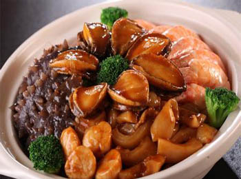 主料:海参(水浸) 150克 虾仁 50克 鱼肚 50克 墨鱼 50克 鸡胸脯肉 50克 猪肚 50克 鸭肫 50克 冬笋 40克 香菇(鲜) 40克 滑子菇 50克