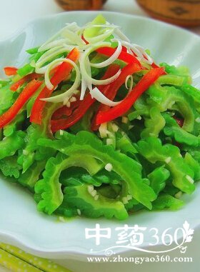 1、将苦瓜一剖两半,去瓤洗净后切薄片,在沸水中烫一下放人凉开水中浸凉捞出,控净水分。